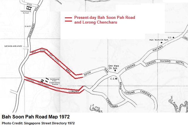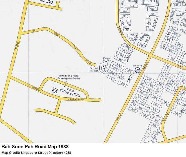 The present-day Bah Soon Pah Road is a remnant of its original longer form in the past, where it was linked to other rural roads such as Lorong Chencharu, Lorong Cherdek, Lorong Mayang, Lorong Mayang Kechil and Lorong Akar. Except for Lorong Chencharu, the rest were expunged when the vicinity was redeveloped as Khatib housing estate in the eighties.