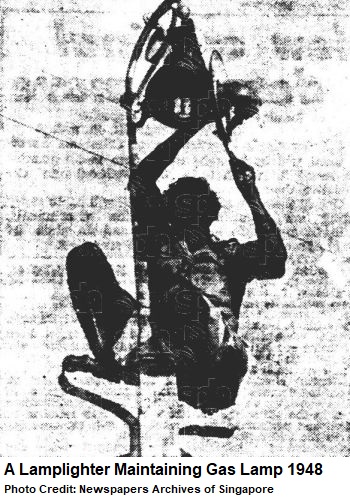 By then, there were several gas lamps left in Singapore. The lamp-lighting had become a sunset industry. In 1948, a team of 25 lamplighters remained hired by the Gas Department of the Singapore Municipality. The Electricity Department, on the other hand, had five technician and a foreman to go around switching on and off the electrical lamps. No ladders or climbing were required as the switches were generally situated at the bases of the lamps. It was obvious that gas lamps would be phased out eventually.